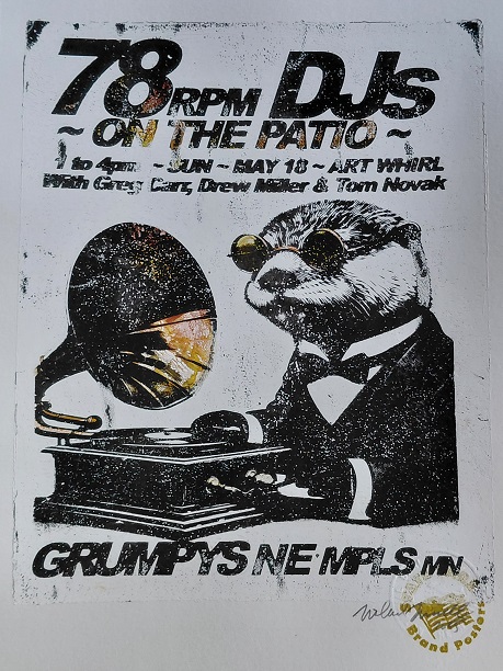 Actually there were only three DJs, Drew Miller, Tom Novak, and Greg Carr took turns playing sets. Four hours of 78 RPM records were spun live at Grumpy’s, NE MPLS, on May 18th, during the 2025, Art-A-Whirl event. Three festive days with hundreds of participating artists and venues. We did our share and this is what it sounded like. The recording is in four, one-hour sound files that are easily transported. You can find them here at archive.org. The wonderful poster is by Mike Suade, who can be found online on instagram – MIKESUADE.